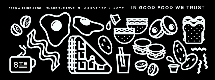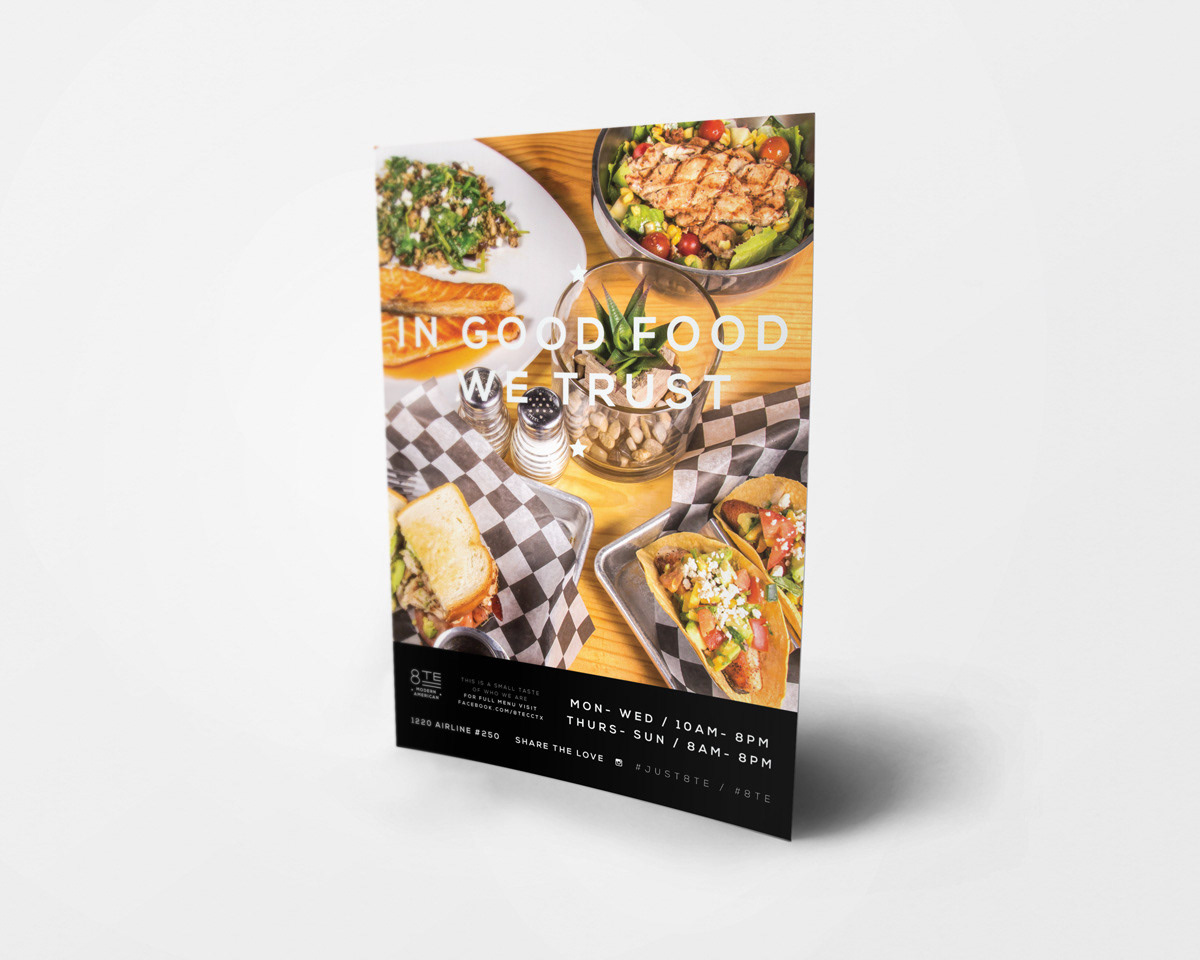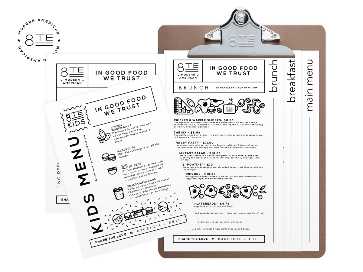 Branding, Social and Menu Design for 8TE Modern American located in Corpus Christi, TX.